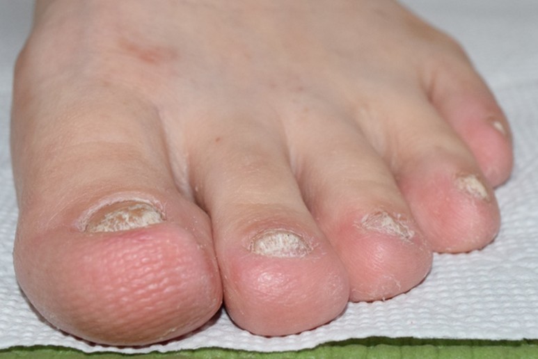 전형적인 WSO 유형에 속하는 발톱무좀으로 감염이 깊어지면서 발톱의 상당 부분이 소실된 모습을 볼 수 있는데요.