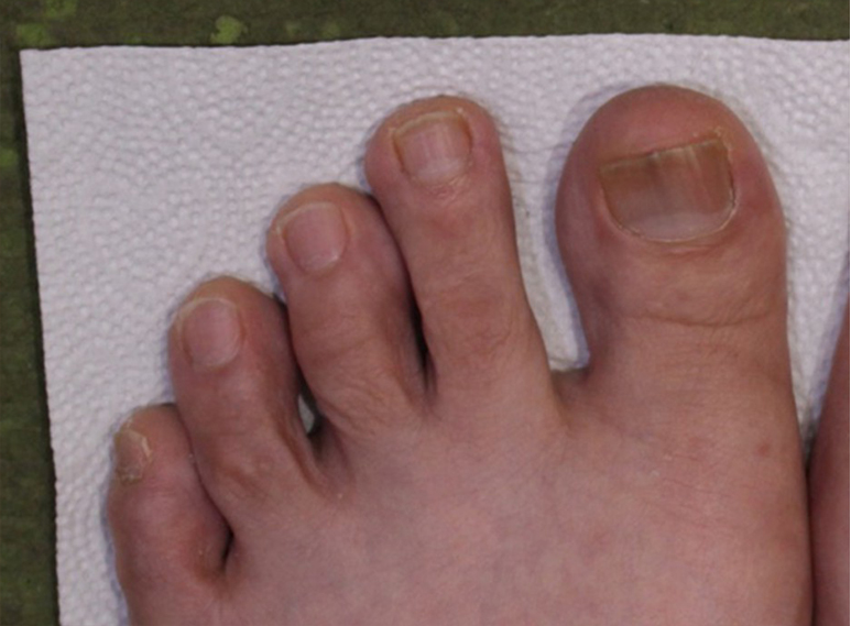위 환자분의 경우 무좀균이 발톱의 원위부(상부)와 측면에서 감염을 일으키는 원위부 조갑하형(WSO, White superficial onychomycosis)에 해당되는 발톱무좀 유형입니다.