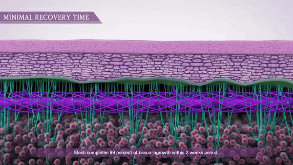 촘촘한 메쉬 그물망 형태가 견고하게 유지되어 메쉬 구멍 사이사이로 피부 조직이 재생되어 유착되기 때문에 더욱 강력한 효과를 기대할 수 있고, 평균 1.5년의 유지 기간을 기대할 수 있습니다. (유지기간의 경우 개인차가 있습니다.)