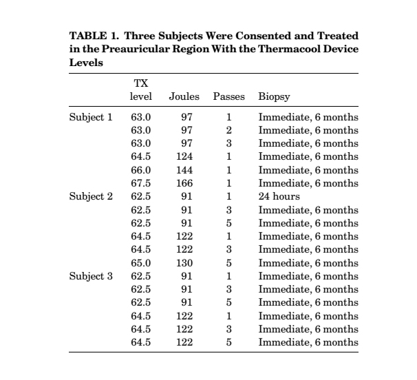 써마지의 에너지 강도와 패스 수를 다르게 설정하여 환자에게 진행한 후 조직검사를 통해 강도 차이에 따른 피부 변화를 확인하는 임상실험에 관한 논문입니다.