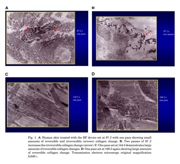 해당 실험에서는 강도가 높으면 높을수록 실제 콜라겐 조직 변화가 더욱 뚜렷하게 나타났는데요. 사실 이러한 반응은 리프팅 레이저의 특성상 당연한 결과이죠. 세게 자극을 주면 줄수록 그만큼 변화가 크게 일어나니까요.