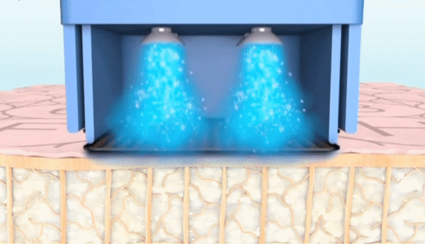 여기서 한 가지 특징이 있다면, 조사 과정에서 강력한 컨택 쿨링 시스템이 작동되어 표피 온도를 지속적으로 낮춰준다는 점입니다. 이를 통해 표피 온도가 과열되어 열손상(물집, 화상)이 일어나는 것을 방지해주지요.
