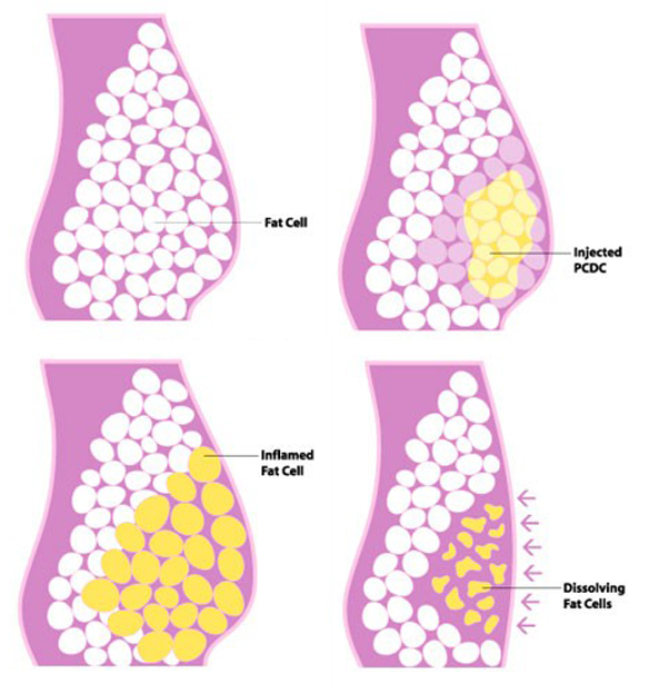 지방분해주사는 축적된 지방세포를 융해시켜 지방세포의 크기를 줄이고 이를 대사작용을 통해 흡수, 제거시키는 원리의 시술입니다.