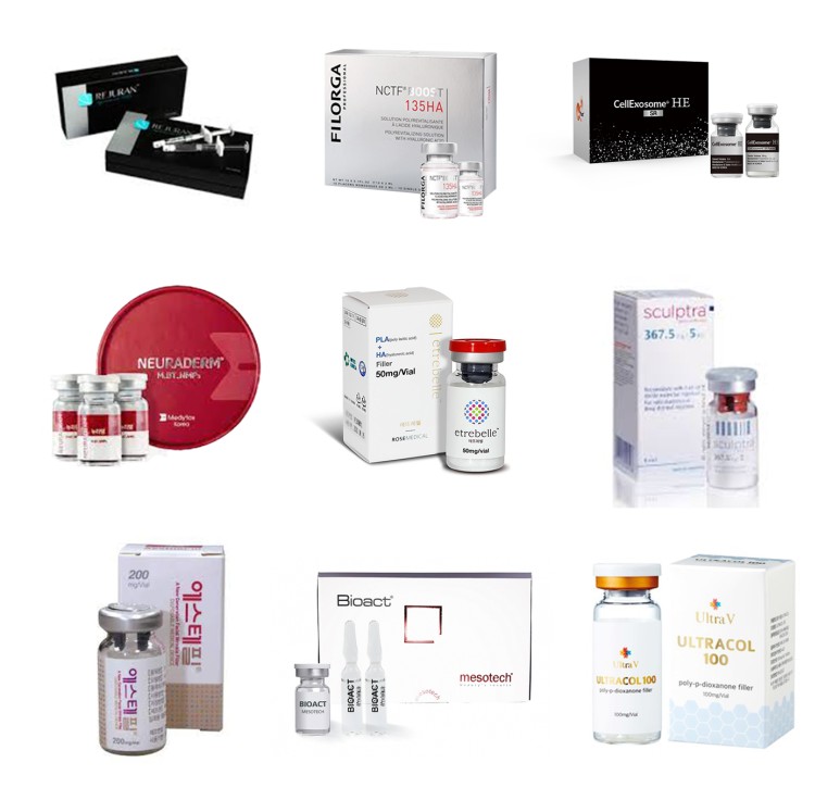 리쥬란힐러, 샤넬주사(필로가 135), 셀엑소좀, 뉴라덤, 에뜨레벨, 스컬트라, 에스테필, 프라다주사(Bioact), 울트라콜 등 병원마다 명칭도 조금씩 다르고 각 시술마다 성분, 효과 등이 다 다릅니다.