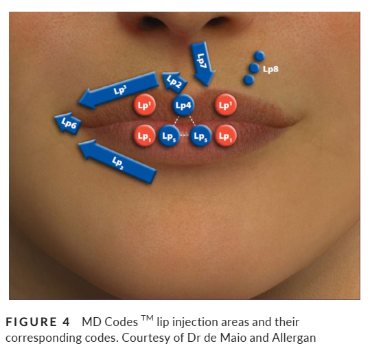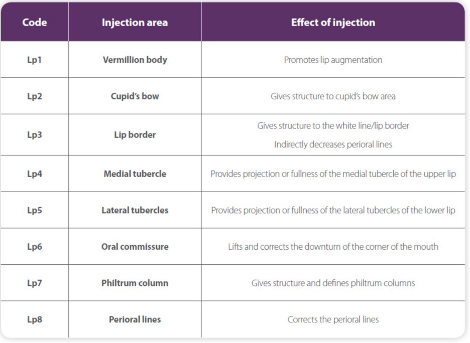 Lp1. Vermillion body (입술 볼륨) Lp2. Cupid's bow (윗입술 인중선) Lp3. Lip border (입술 윤곽선) Lp4. Medial tubercle (윗입술 튜버클) Lp5. Lateral tubercles (아랫입술 튜버클) Lp6. Oral commissure (입꼬리 윤곽선) Lp7. Philtrum column (인중선) Lp8. Perioral lines (입가주름) |