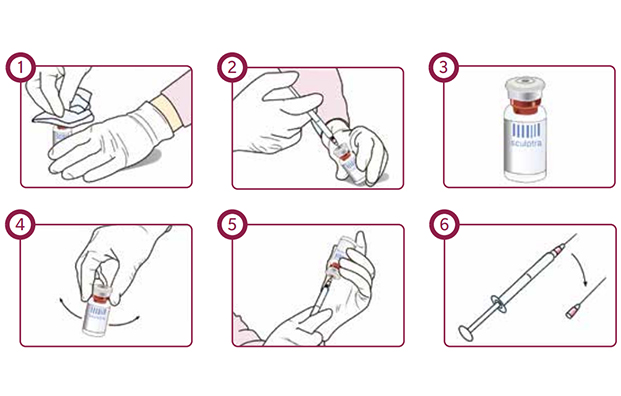 스컬트라의 경우 파우더 형태로 되어 있어 '수화'라고 하여, 물을 넣어서 미숫가루처럼 뭉치지 않게 현탁액을 뽀얗게 만드는 과정을 진행하게 됩니다.
