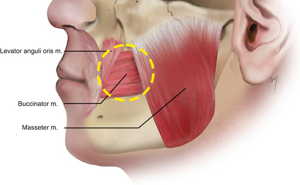 사각턱 보톡스를 주입하는 저작근(Masseter)을 보면, 입가 쪽으로 심부에 지방이 있고, 그 아래에 협근(Buccinator Orbicularis oris)이라는 것이 자리잡고 있습니다.