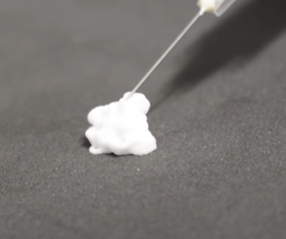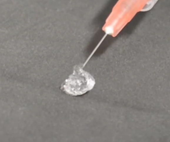 이런 엘란쎄 필러는 히알루론산과 달리 위와 같이 불투명한 특성을 가지고 있으며, 빛의 산란 현상이 쉽게 나타날 수 없는 구조로 이루어져 있습니다.