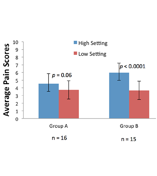 총 31명의 실험자를 기준으로 울쎄라의 에너지 강도를 각각 레벨 4(High Setting / 파란 막대), 레벨 2(Low Setting / 빨간 막대)로 셋팅한 후 부위별로 시술을 진행해 통증 강도를 확인하는 실험인데요.