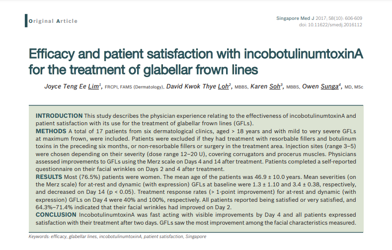 보툴리눔톡신 A(보톡스)를 이용한 미간 주름 개선의 효능과 환자의 만족도를 확인하는 논문 자료입니다.