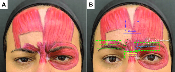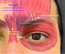 이는 눈썹주름근(Corrugator)의 상부 쪽으로 너무 많은 용량의 보톡스를 주입해 보톡스가 전두근(Frontalis)까지 확산되면서 나타나는 부작용인데요.