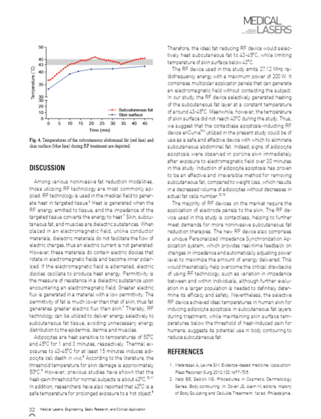 고주파(RF)는 피부보다 지방에 훨씬 강하게 작용하여 지방을 쉽게 가열시키기 때문에 표피, 진피의 열손상을 일으키지 않고 지방세포 사멸을 유도하는 역할.