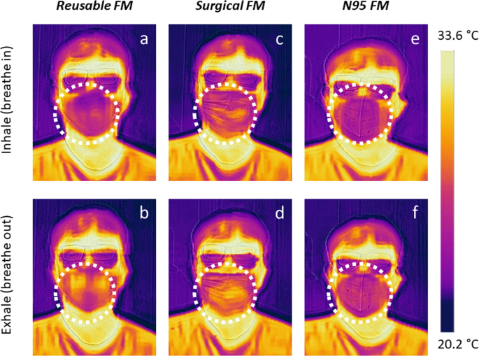 위 사진은 마스크 착용 전, 후 온도를 비교한 사진인데요. 표면상으로 보면, 착용 한 후에 마스크 표면 온도는 낮아 보이지만 실제 내부 온도, 습도는 외부보다 훨씬 높아지게 됩니다.