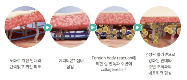 잼버실 살입 후 이물 반응(Foreign body reaction)에 의해 체내의 콜라겐 생성이 자연스럽게 유도되는데, 이런 과정은 실이 생분해되는 동안 지속적으로 일어나게 됩니다.