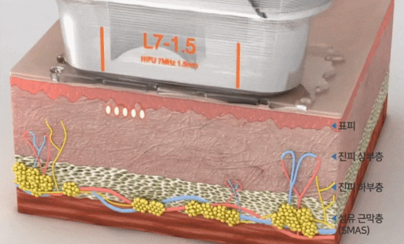 위의 이미지에 나오는 것처럼 초음파 에너지를 한 곳에 집속시켜 열 응고점을 형성해 열에너지를 전달하는 방식으로 열 응고점을 중심으로 주변 피부 조직이 수축하면서 타이트닝, 리프팅 효과가 나타나는 원리입니다.