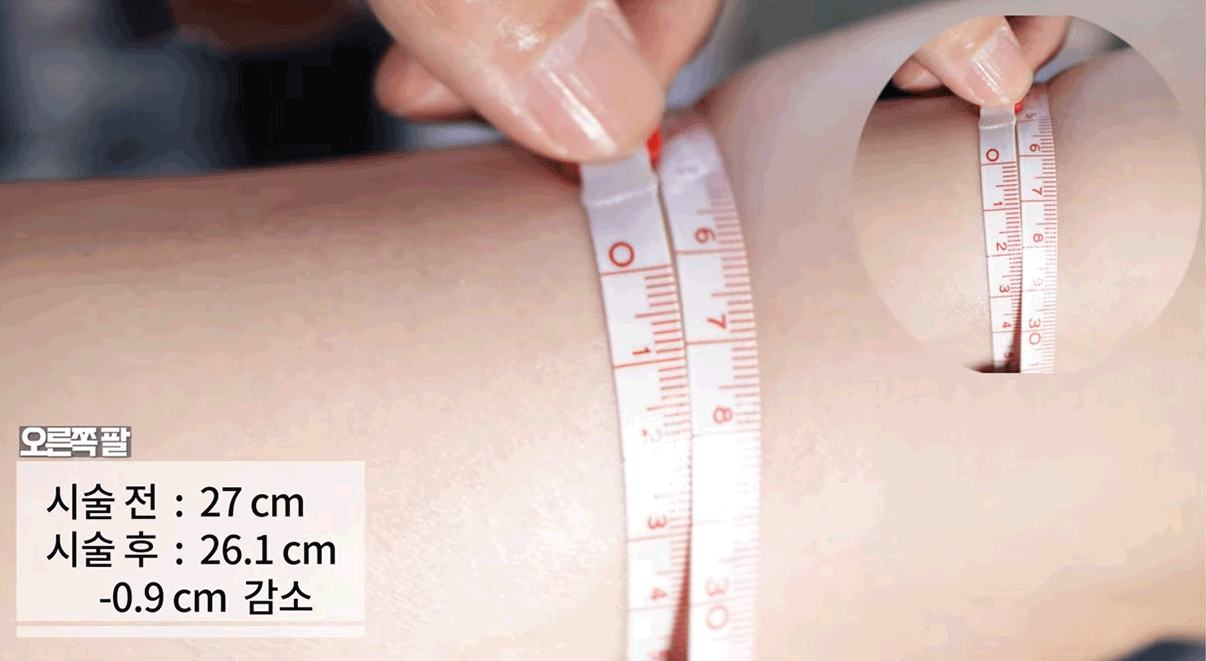 시술 전 양팔 모두 27cm에서, 시술 후 26cm로 약 1cm씩 감소한 모습인데요. 시술 직후임에도 변화가 생각보다 크죠?