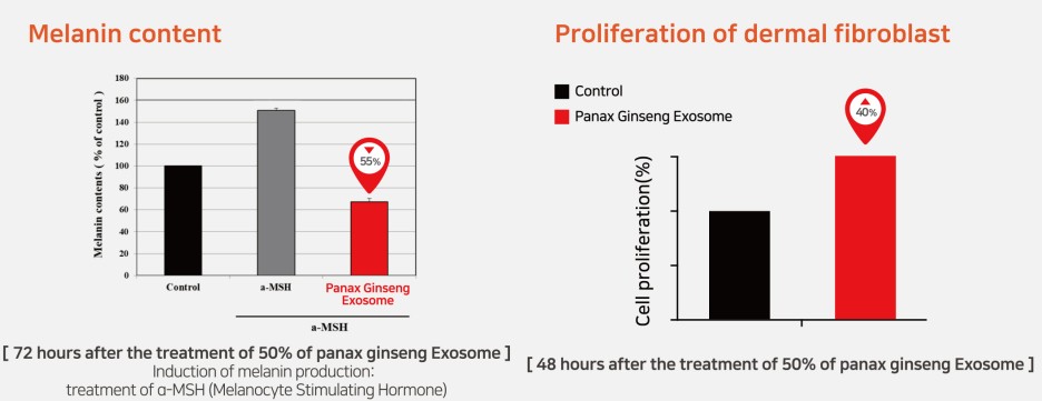 실제로 멜라닌 생성(왼쪽 그래프)이 억제되고, 콜라겐 생성에 관여하는 섬유아세포가 증가(오른쪽 그래프)했다는 데이터도 있고요.