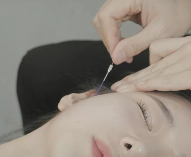 시술 부위를 국소 마취한 후, 실이 들어갈 위치에 미리 니들을 이용해 자입점을 형성하는 과정입니다.