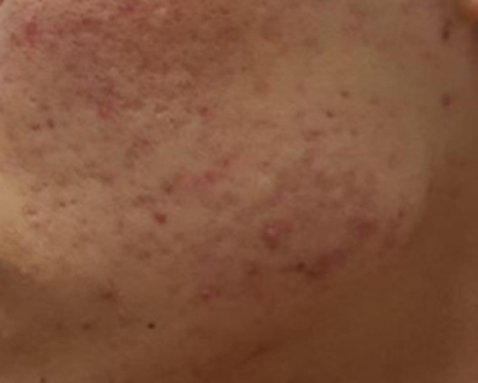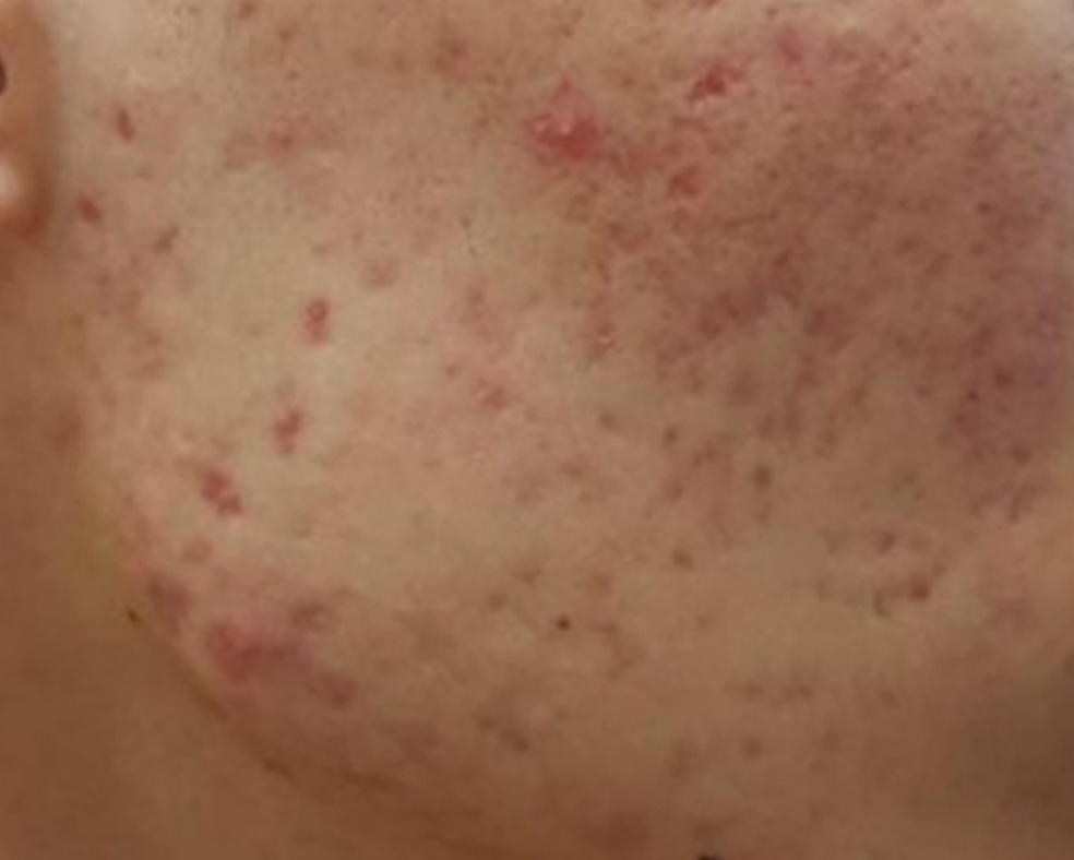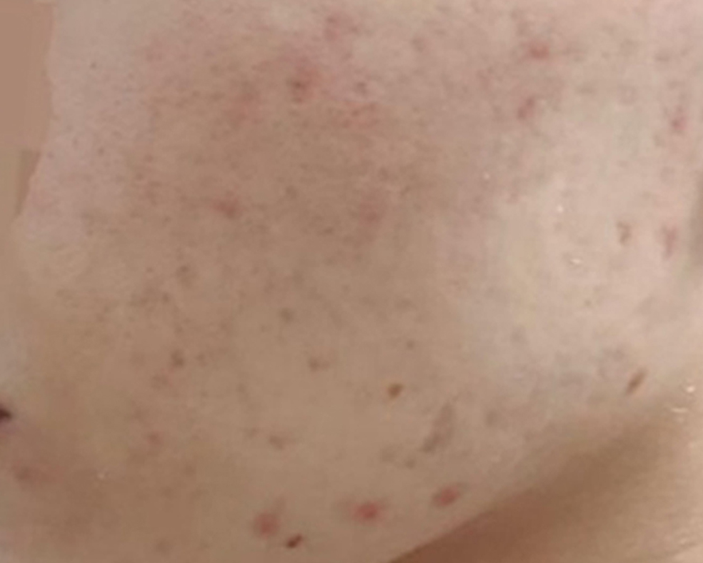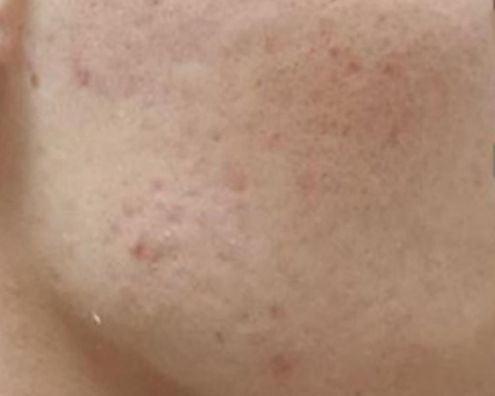 사진으로만 봐도 알 수 있듯이 양 볼에 여드름 흉터, 자국이 가득 쌓인 상태인데요.