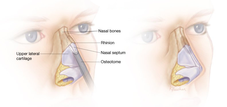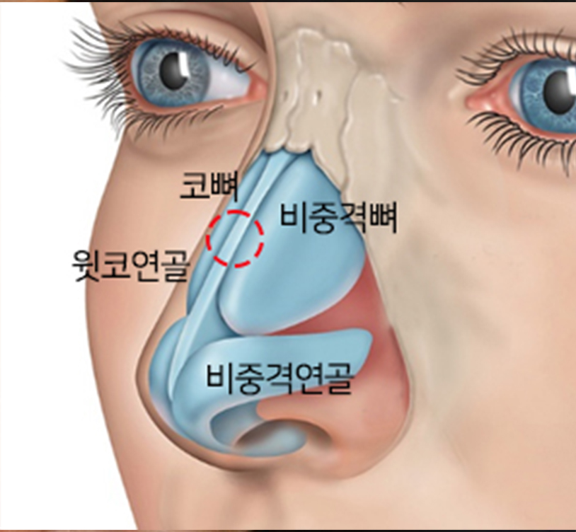 매부리코가 되는 원인은 비중격뼈와 비중격연골이 만나는 지점이 과도하게 돌출되는 것이 주요한 원인입니다.