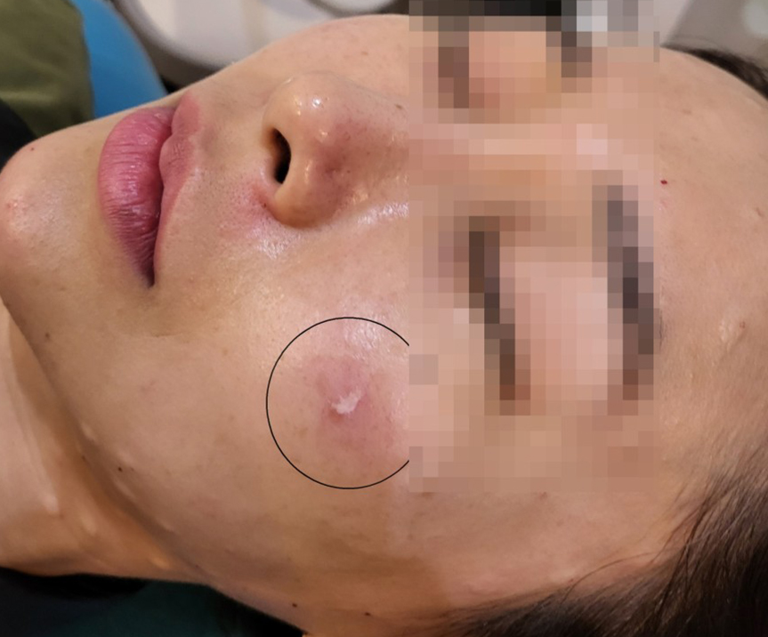 흉터 부위의 새살 주사 시술이 진행된 모습 그리고 피부 곳곳에 볼록하게 돌출된 엠보싱 현상이 보일 텐데, 이런 증상은 1~2일 내로 성분이 흡수되면서 자연스럽게 사라지기 때문에 크게 우려하지 않아도 됩니다.
