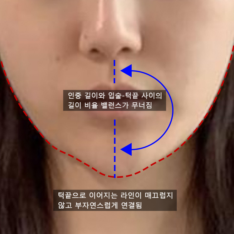 무턱필러 시술로 턱끝을 길게 연장시키면, 턱끝이 살아나면서 좀 더 샤프한 느낌을 줄 수 있는데요. 이 때 인중 길이보다 턱끝이 너무 길어지면 보이는 것처럼 인위적이고 부자연스러운 모습이 되고 맙니다.