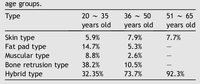 아시아인의 팔자주름을 분류하고 수술법을 정리한 논문자료인데, 이 논문에서는 연령대에 따라 각 팔자주름의 유형 비율을 정리해둔 아주 좋은 자료가 있더군요. (900명 정도의 환자가 표본이라, 어느 정도 신빙성이 있는 자료입니다.)