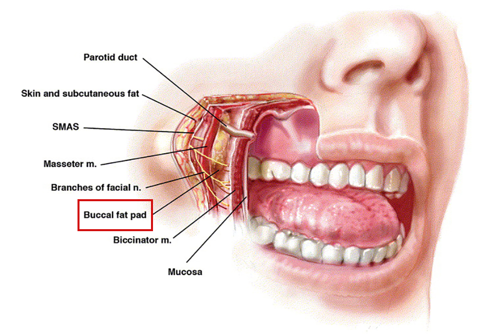 위 그림에 보이는 것처럼, 피부 속 깊은 곳에 위치해있는 지방으로 침을 분비하는 관과 저작 근육을 보호하는 역할을 하지요.