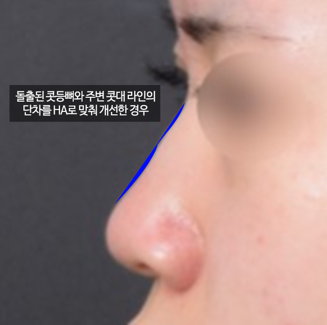 위 환자분처럼 중간에 돌출된 콧등뼈 때문에 코 라인이 울퉁불퉁한 경우, 돌출된 콧등뼈를 기점으로 코끝부터 콧대 라인을 히알루론산(HA) 필러를 이용해 단차를 맞춰서 개선할 수 있는데요.