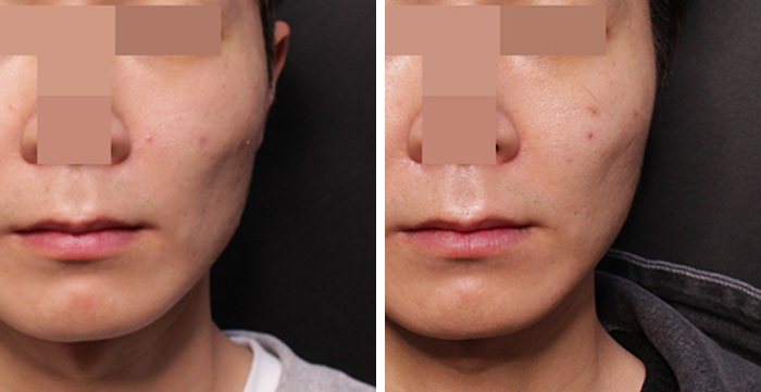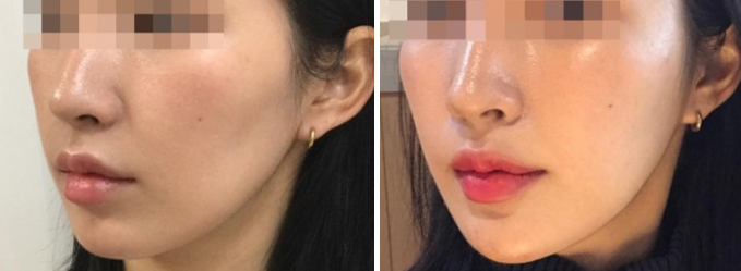 그럼에도 시술 전과 비교했을 때 볼꺼짐이 완화되면서 볼 부위에 음영이 크게 줄어든 것을 볼 수 있지요?