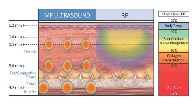 온다는 에너지 전달율만 보았을 때, 표피에서 거의 열을 소실하지 않고 진피, 피하지방, 근막까지 약 80%에 달하는 에너지를 전달할 수 있습니다.