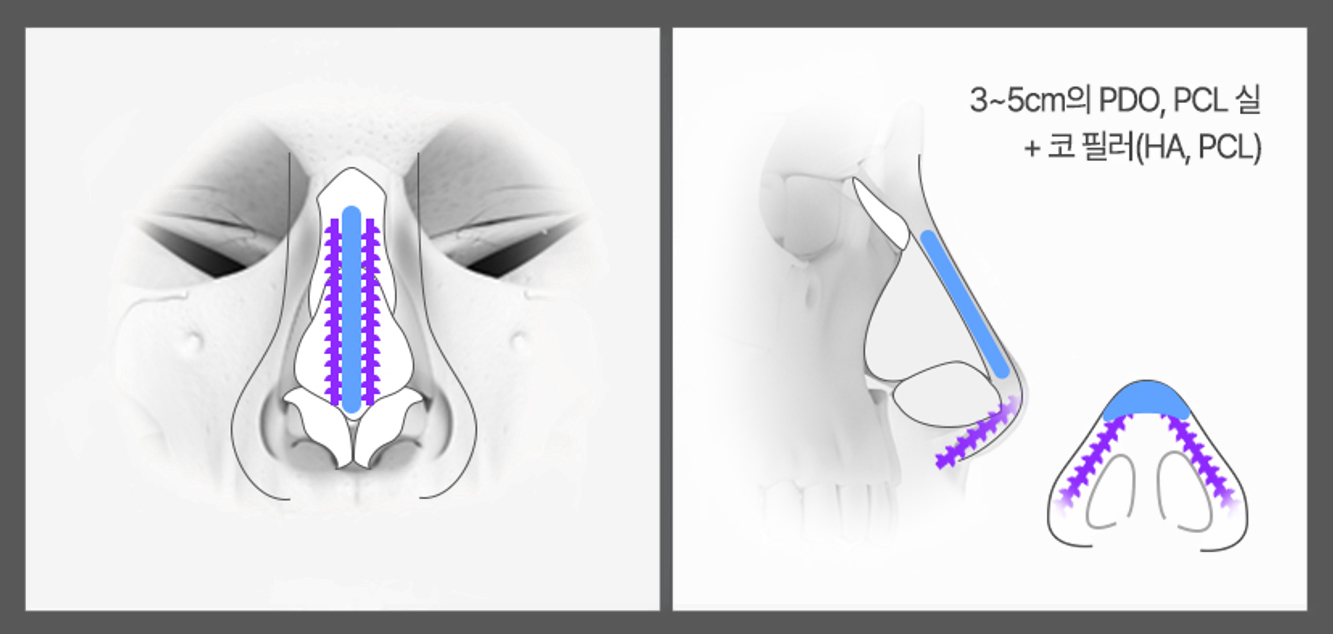 이 때 코에 삽입한 실이 필러의 지지대 역할을 해주기 때문에 필러가 퍼지지 않고 오랜 기간 유지되고요.