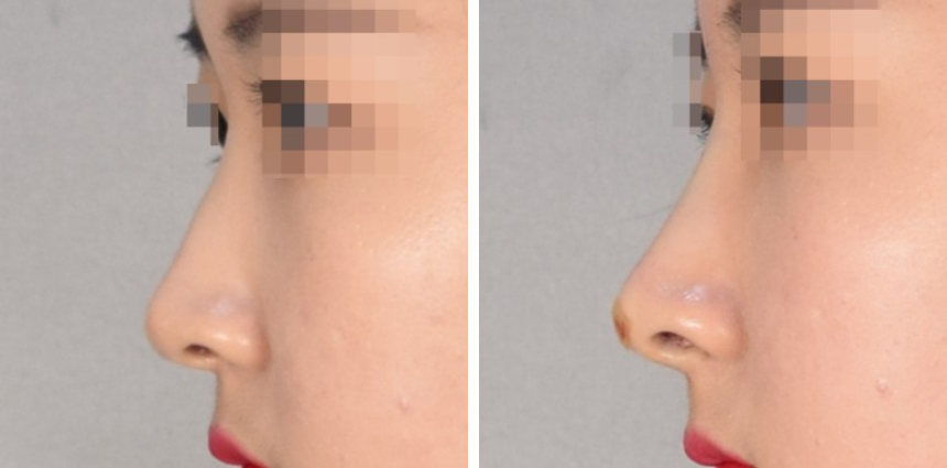 사진을 보면 아시겠지만, 코끝은 필러를 지지해줄 수 있는 조직이 거의 없어 시간이 지나면 초기 모양을 완전히 잃고 위와 같이 퍼진 상태가 되고 맙니다.