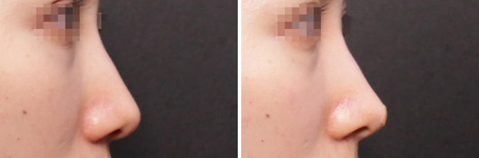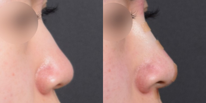 시술 전 모습과 비교해보면, 앞서 문제점으로 지적했던 부분들(돌출된 매부리, 뭉툭하고 낮은 코끝, 울퉁불퉁한 콧대)이 개선된 것을 확인할 수 있는데요.