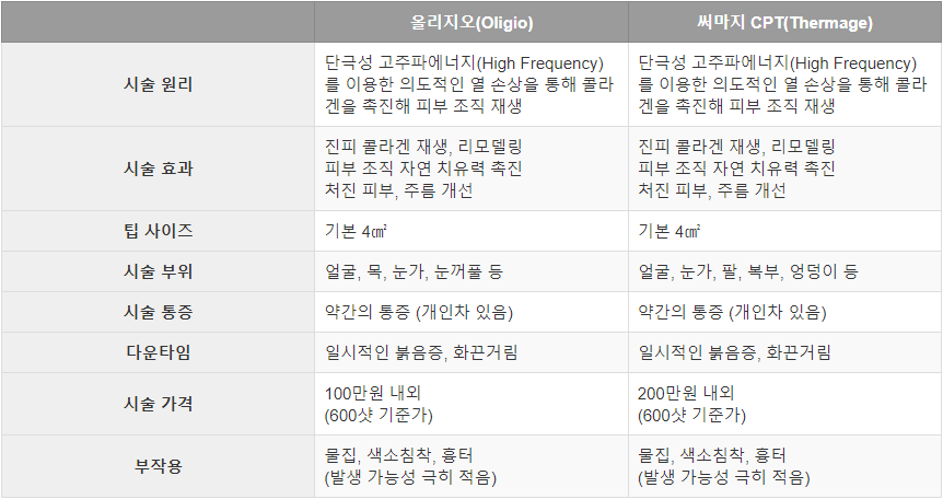 써마지가 올리지오에 비해 에너지 정확도, 강도 등 여러 측면에서 우위에 있기 때문에 효과만 보았을 때 올리지오보다 더 뛰어난 편인데요.