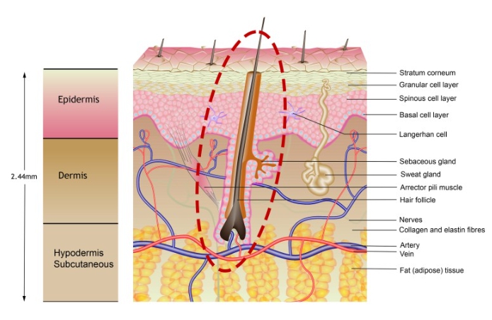 이는 모공의 조직적 특성과 연관이 있는데, 모공을 보면 진피 내에 콜라겐 섬유와 탄력 섬유로 둘러 쌓여 있는 모습입니다.
