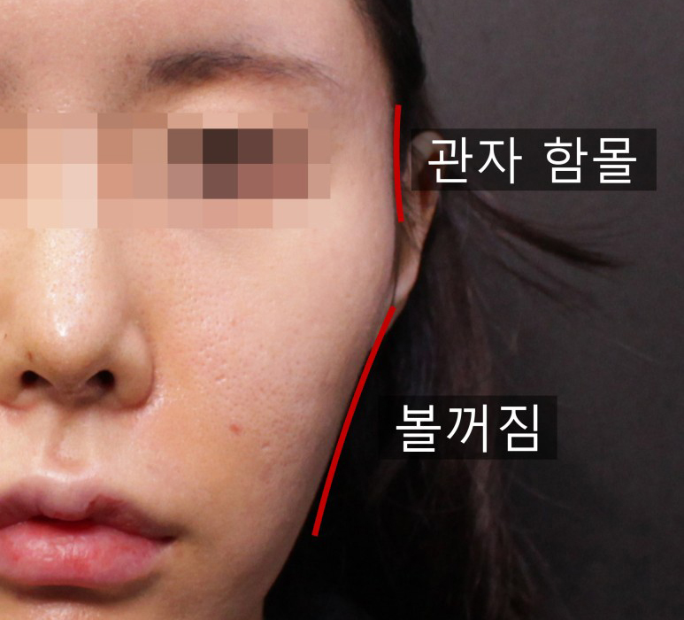광대 돌출이 아닌, 관자 부위의 함몰과 볼꺼짐이 주요한 원인으로 보이지요?