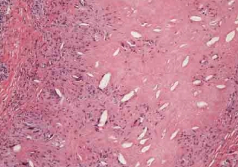 위에 보이는 것처럼 스컬트라 결절이 발생하면 단단한 거대다핵세포들이 피부 속에 분포되어 있는 것을 볼 수 있죠.