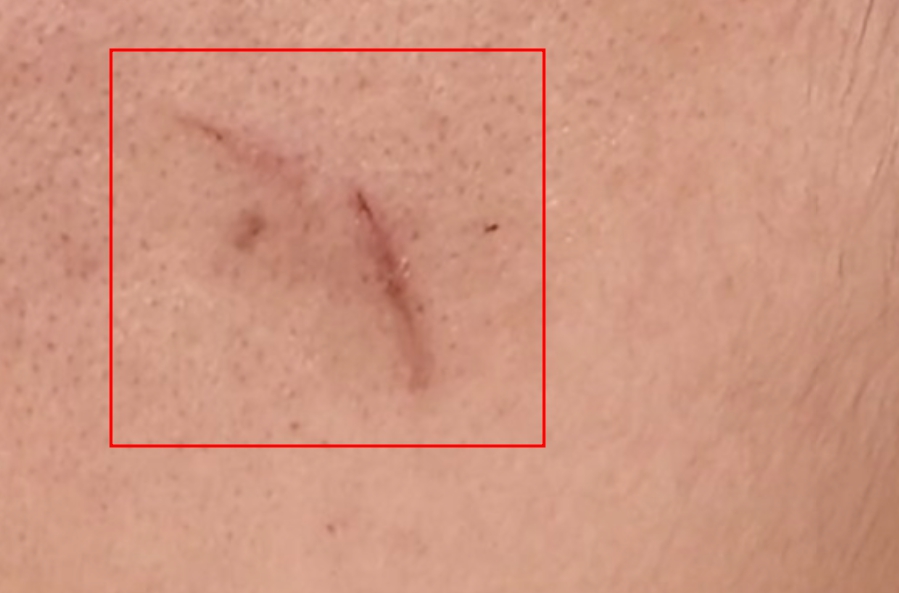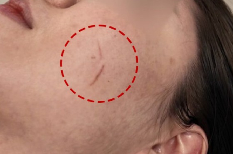 흉터 부위를 확대해서 보면, 얼굴에 약 1.5cm ~ 2cm 정도 되는 긁힌 흉터가 남아있는 모습을 확인하실 수 있죠.