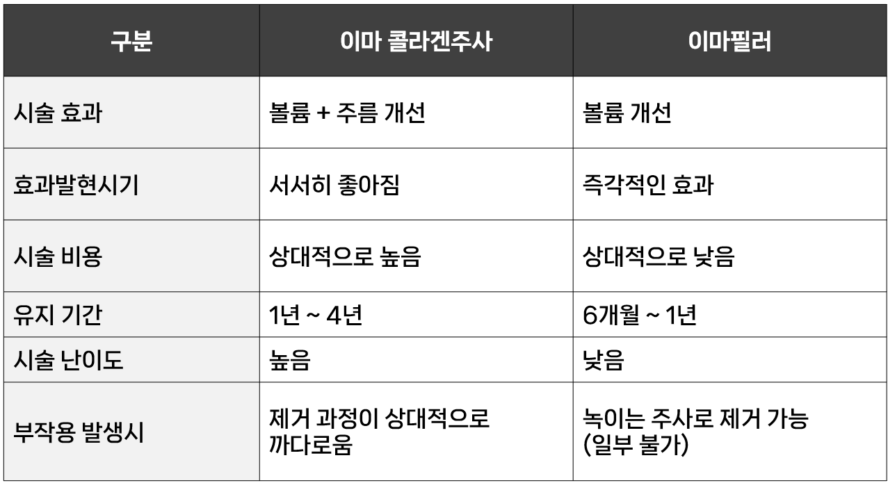 개인마다 이마가 꺼진 정도, 이마주름, 원하시는 볼륨감 및 라인 정도가 모두 다르기 때문에.. 의료진과 상담 후 시술을 결정하는 것이 중요하겠으나 우선 각 시술의 특징을 요약해보면?