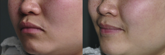누워있을 때 팔자주름이 조금 더 옅지만, 지방이 두터워 팔자 상부 쪽의 오목함은 그대로 유지되는 모습이지요?