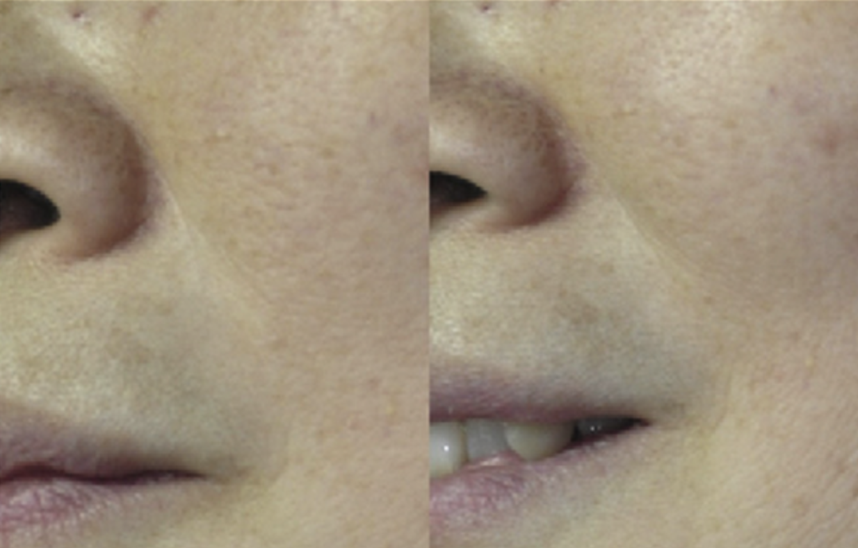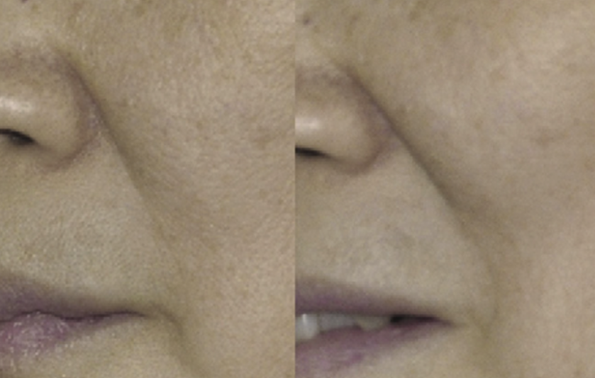 누워있는 상태에서는 피부가 아래로 처지지 않아 팔자주름이 거의 보이지 않지만, 서 있을 때는 피부가 아래로 처지면서 팔자주름이 잡히는 모습을 확인할 수 있죠.