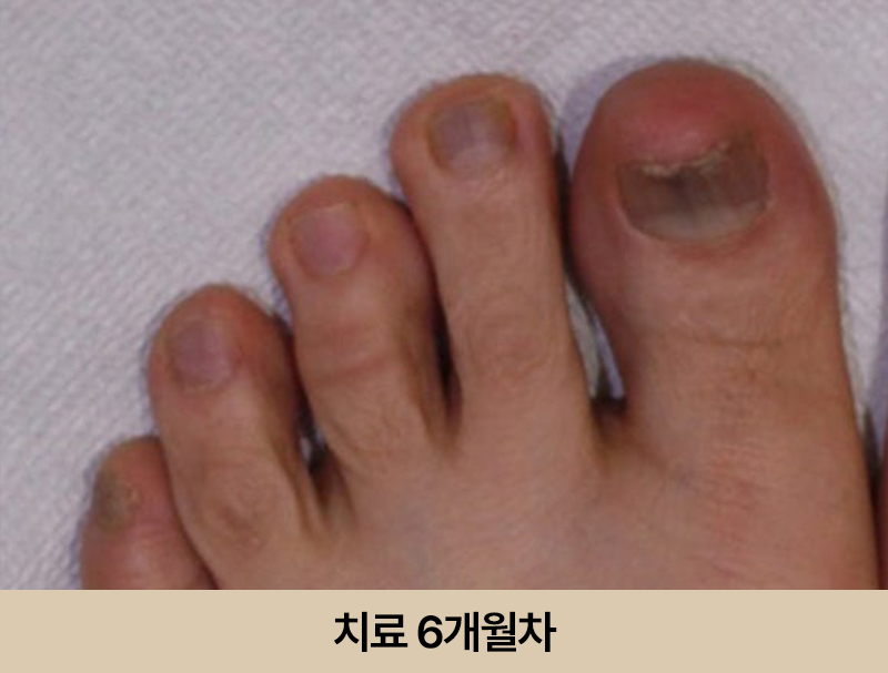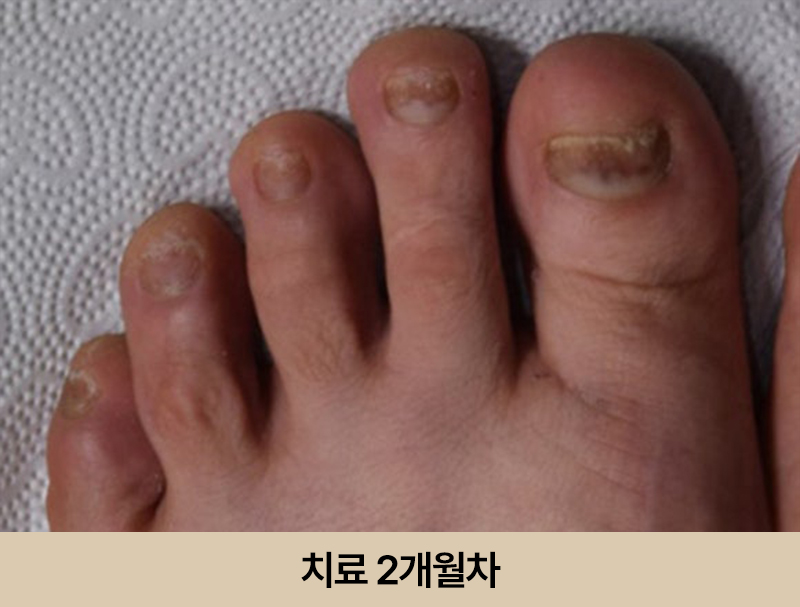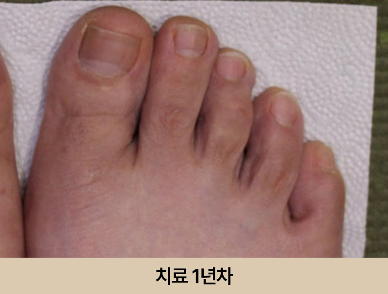 치료 전과 1년 후 경과를 보면, 엄지 검지 발톱 상태도 정상화되었고 나머지 발가락의 상태도 모두 좋아진 것을 볼 수 있습니다.