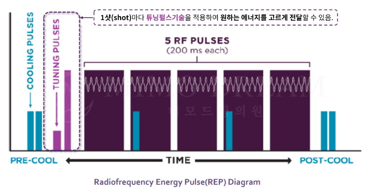 에너지가 전달되는 과정에서 쿨링 시스템이 동시에 작동해 피부 표면 온도를 낮춰주어 피부 표면의 손상 방지와 통증 감소 효과를 기대할 수 있죠.