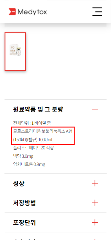 코어톡스의 주 성분을 보면, 클로스트리디움 보툴리눔독소 A형(150kDA) 라고 표시된 것을 확인하실 수 있습니다.
