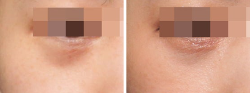 시술 전, 눈밑꺼짐과 함께 색소침착이 같이 보이는 모습인데 우리 병원의 눈밑 콜라겐주사 시술 후 상당히 개선된 모습을 확인하실 수 있습니다.