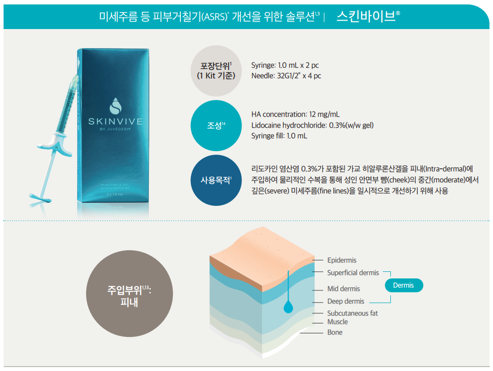 지난 7월, 쥬비덤과 보톡스로 유명한 글로벌 제약사 앨러간(Allergan)에서 개발한 스킨바이브를 국내에 출시했습니다.