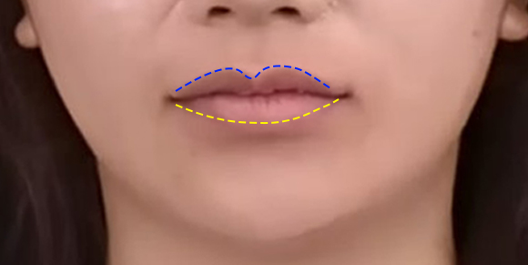 이상적인 입술 비율은 1:1.6 정도로, 아랫입술이 윗입술보다 조금 더 볼륨감이 있어야 입술의 비율이 좋아보입니다.