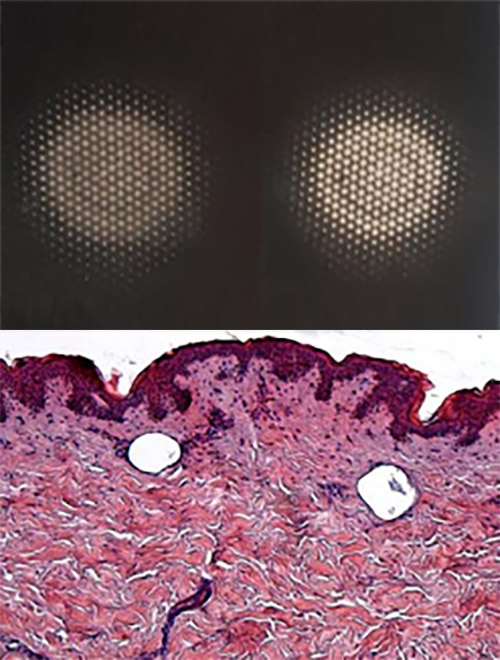 비박피성 프락셀 레이저는 박피성 프락셀과 다르게, 피부층에 손상을 거의 주지 않고 진피층을 타겟으로 에너지를 전달하여 LIOB 반응(아래 조직학 사진 속 하얀 공동 공간)을 유도하고 내부에서부터 흉터가 차오르게 만들어주는 치료인데요.
