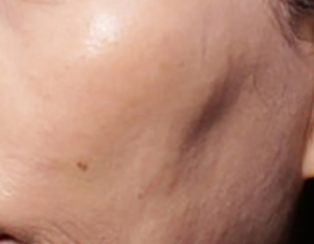 확대해서 보면, 옆볼꺼짐 부위가 얼마나 좋아졌는지 더 자세하게 비교해볼 수 있죠.